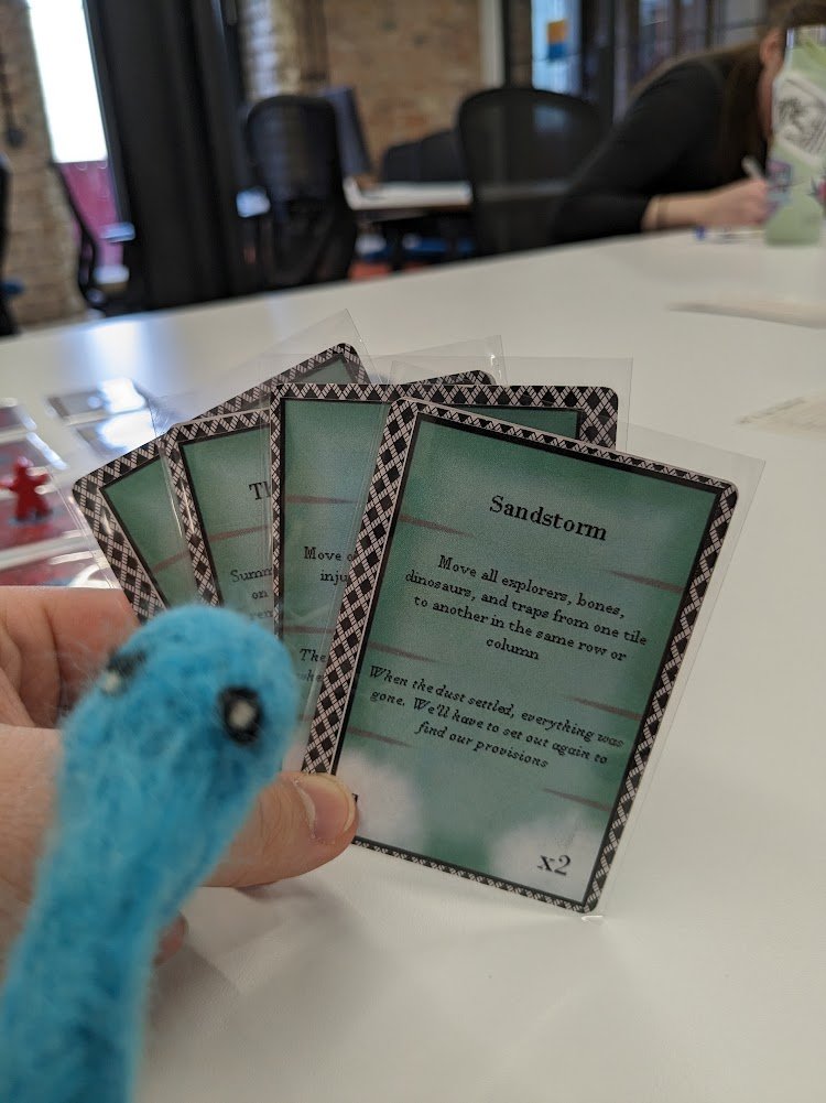3 Players are explorers, who move around the island uncovering tiles, trying to avoid haunted tiles. One player is the Dinosaur Spirit, who controls the ghostly apparations that roam the island, attacking the explorers to try to stop them. Take too long to destroy his bones, and the dinosaur spirit might be able to remake his physical form!